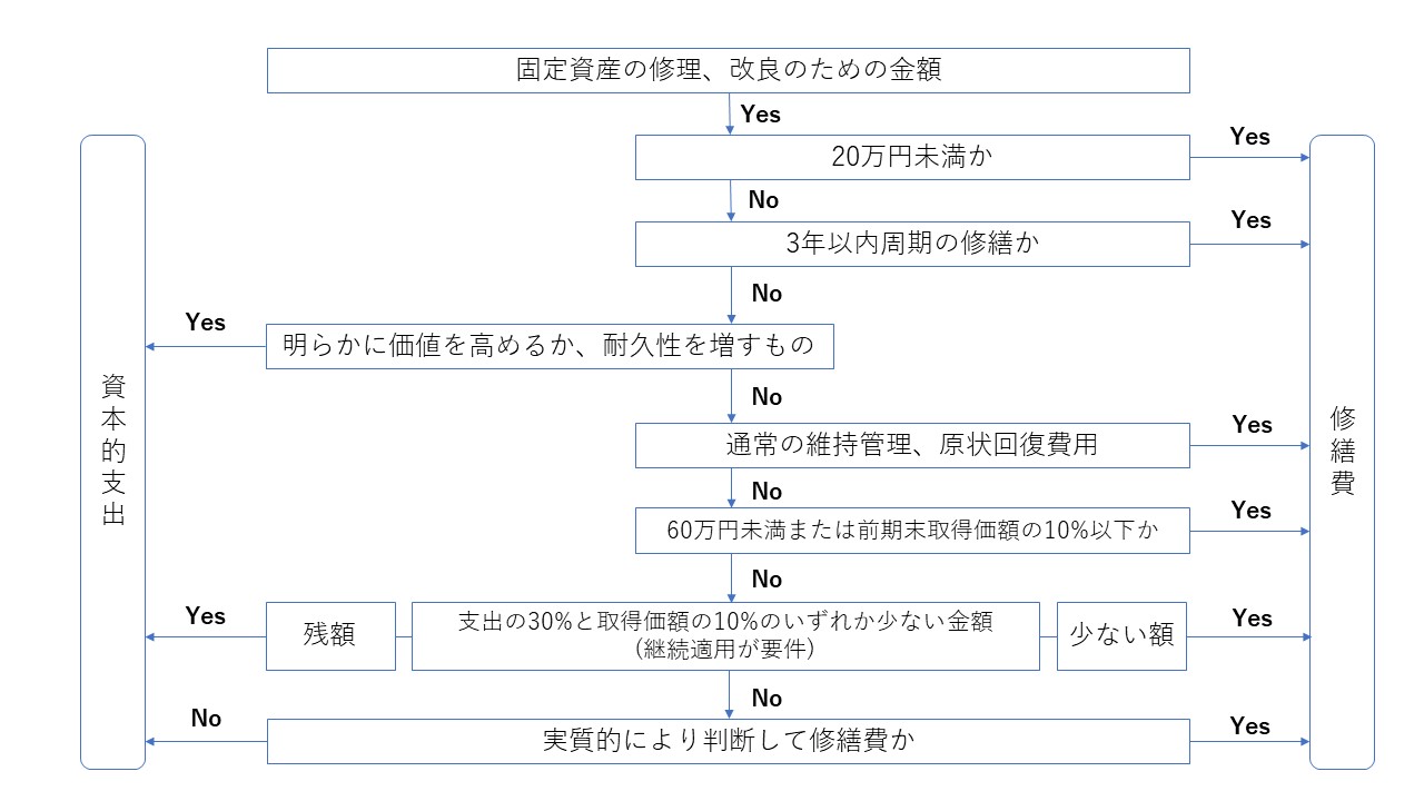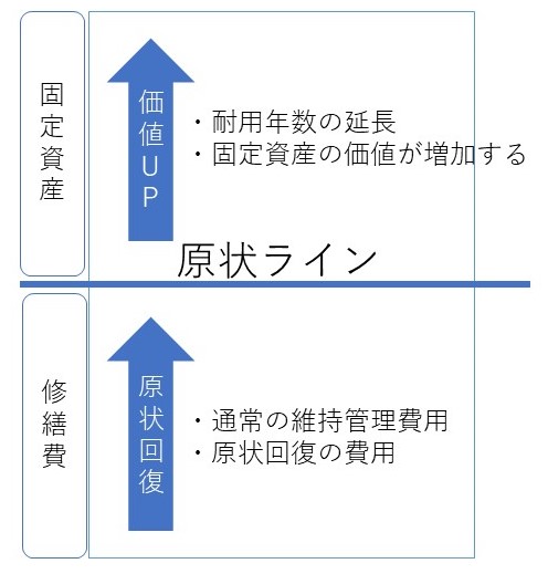 原状回復のための費用であれば「修繕費」となりますが、これが改善や改良などの①耐用年数の延長、②固定資産の価値が増加するものであれば「資本的支出」と呼ばれて「修繕費」と区分されます。