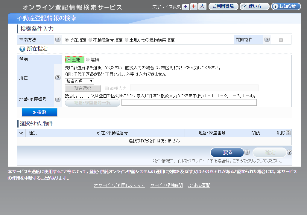 不動産番号が分かっていれば迷うことなく検索できますが、ここで注意点としては、所在の指定は住所ではなく所在地を入力します。