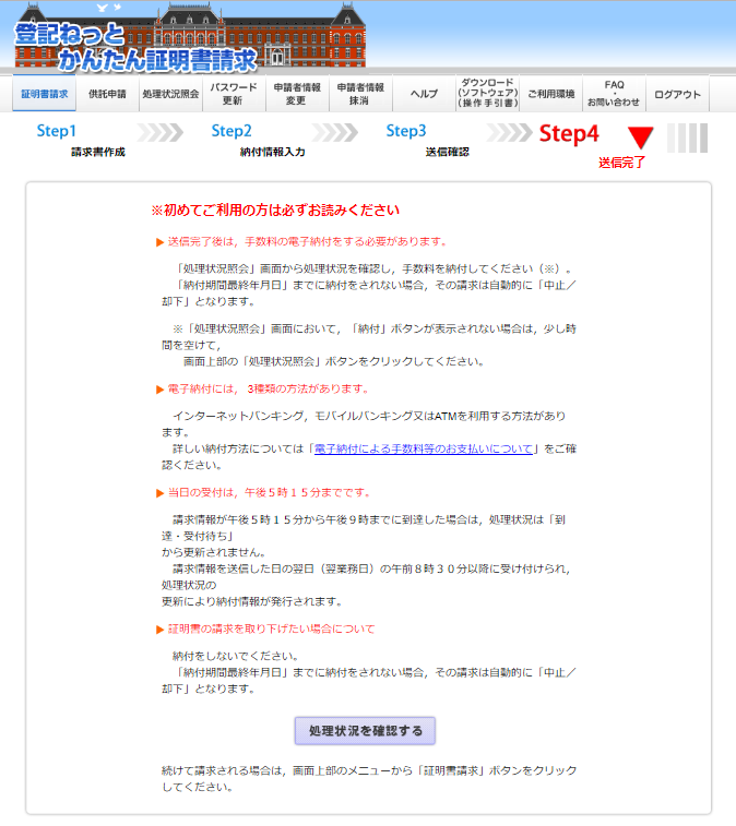 送信完了になると、処理状況を確認して納付手続きに移ります。