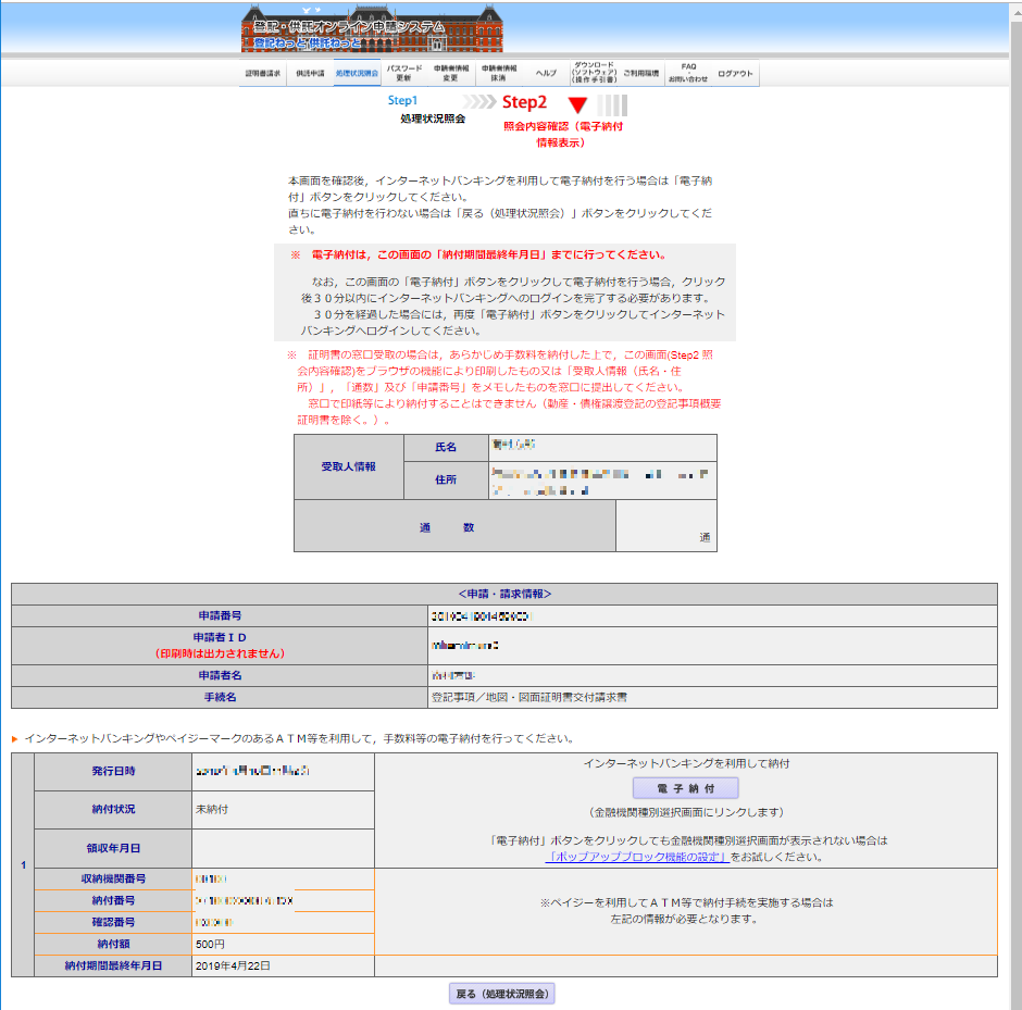 表示内容を確認して「電子納付」のボタンを押して、インターネットバンキングで手数料を納付します。