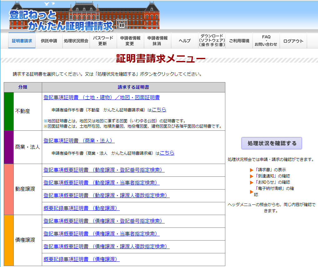 ログイン後は必要な証明書区分にしたがって、今回は不動産の「登記事項証明書」をクリックします。