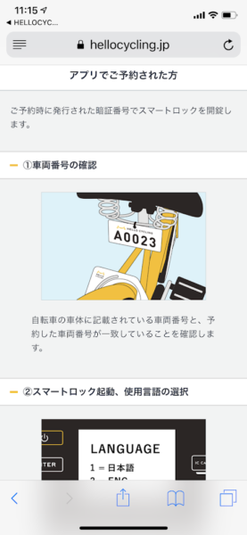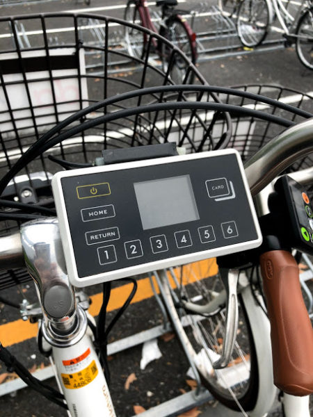 ハンドルにはスマートロックという端末機が備え付けられているので、端末機の電源をONにして、使用言語を選択した後に、予約時に発行される暗証番号4桁を入力すると、カチャっと後輪の施錠が解除されます。