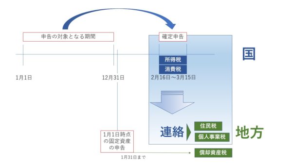 確定申告とは別に、地方がその年の1月1日時点に事業用で使っている資産に対して「償却資産税」がかかてきます。