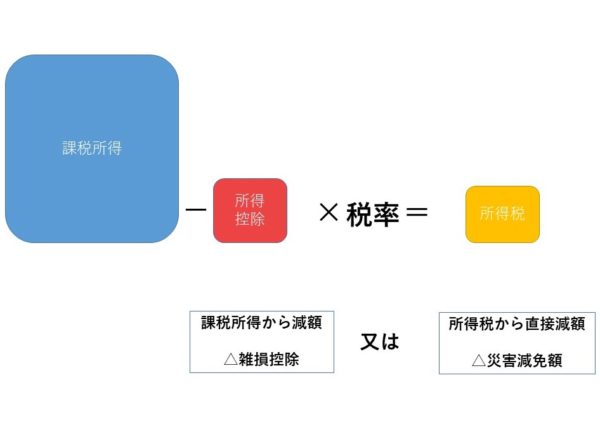 ①雑損控除は、所得税を計算する過程で、所得に税率を掛ける前の所得から、医療費控除などと同じように所得から控除されます。